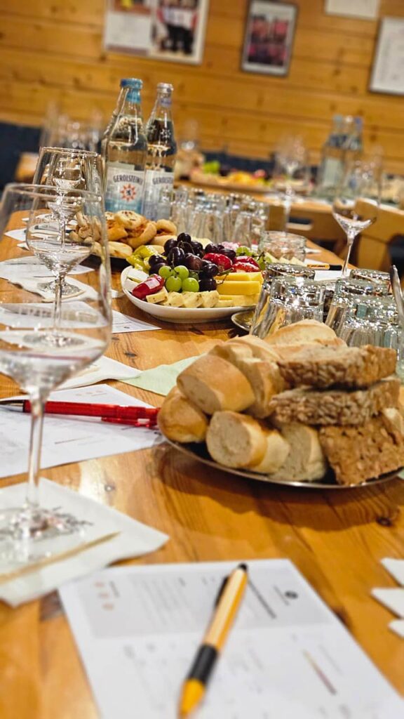 Auch kulinarisch war der Abend bestens organisiert. Eine große Käseplatte mit verschiedenen Sorten, ergänzt durch Brot, kleine Häppchen und weitere Leckereien, rundete das Angebot ab. So ließ sich wunderbar probieren, kombinieren und immer wieder ein neuer Wein mit einem passenden Bissen verbinden.